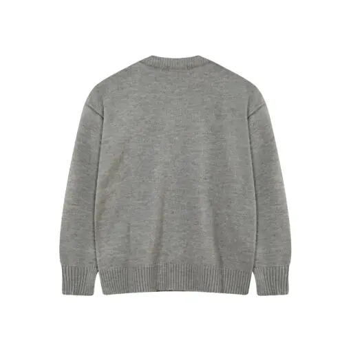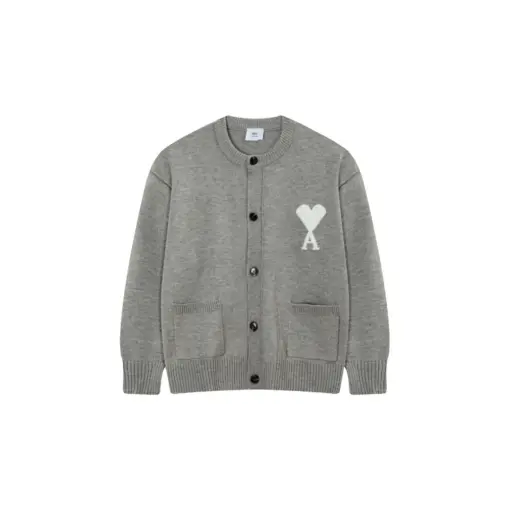 Ami Paris ADC Merino Heart Shaped Alpaca Blend Soft Cozy Knit Cardigan Round Neck Sweater Light Gray