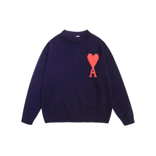 Ami Paris De Coeur Wool Crewneck Sweater Royal Blue With Red Intarsia Heart Logo