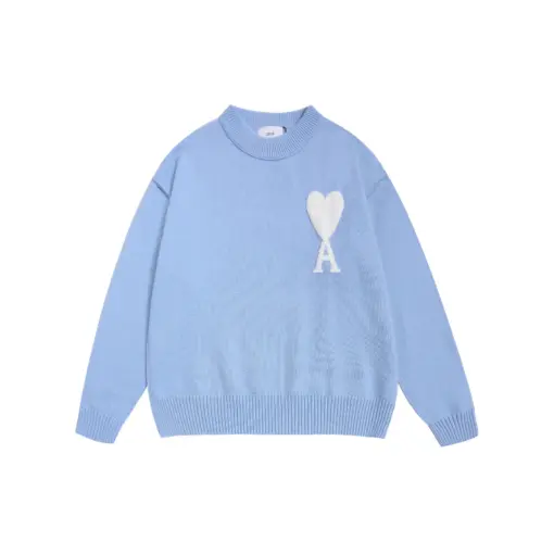 Ami Paris De Coeur Wool Crewneck Sweater Sky Blue With White Intarsia Heart Logo