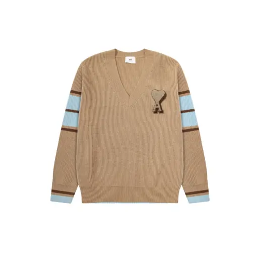 Ami Paris Heart Shaped Towel Embroidery Jacquard ADC Wool V Neck Sweater Camel