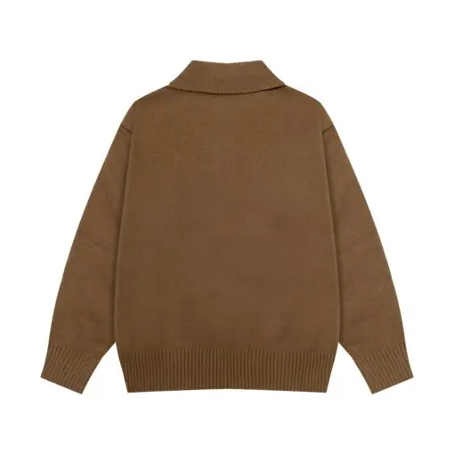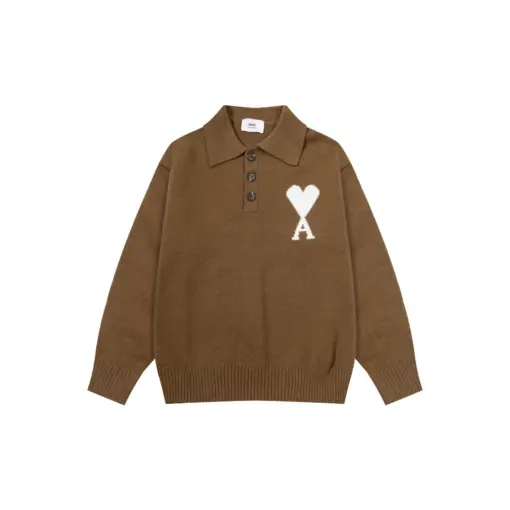 Ami Paris White Heart Jacquard Alpaca Blend Loose Polo Neck Pullover Sweater Khaki