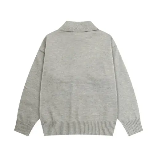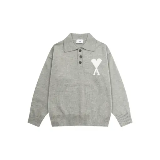 Ami Paris White Heart Jacquard Alpaca Blend Loose Polo Neck Pullover Sweater Light Gray