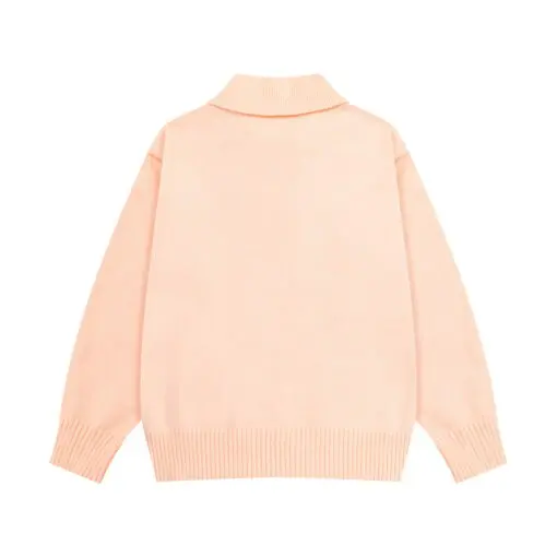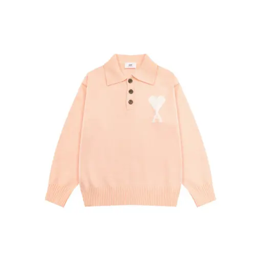 Ami Paris White Heart Jacquard Alpaca Blend Loose Polo Neck Pullover Sweater Light Pink