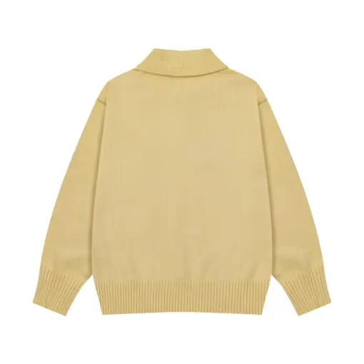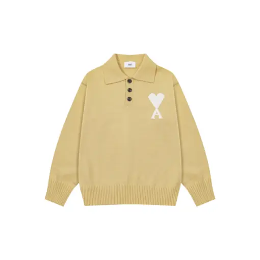 Ami Paris White Heart Jacquard Alpaca Blend Loose Polo Neck Pullover Sweater Light Yellow