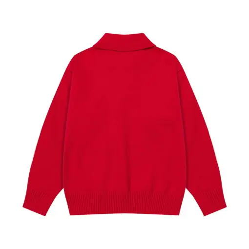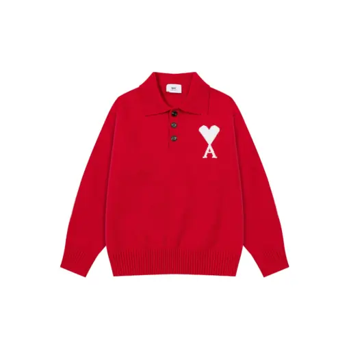 Ami Paris White Heart Jacquard Alpaca Blend Loose Polo Neck Pullover Sweater Red
