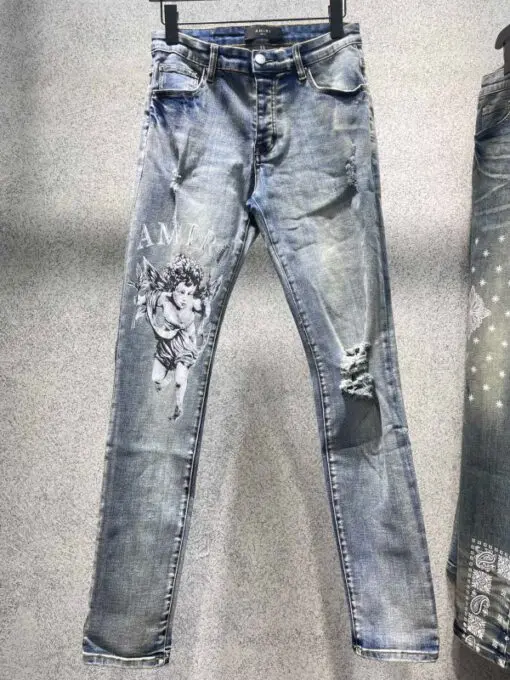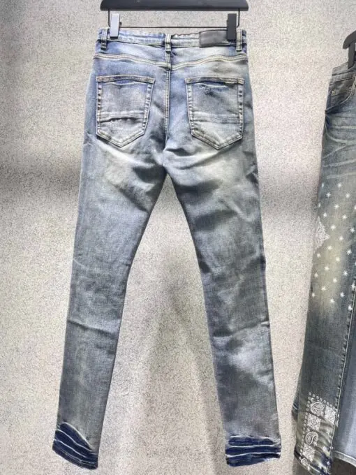 Amiri Men’s Skinny Distressed Jeans With Blue Leather Details And Washed Damaged Finish