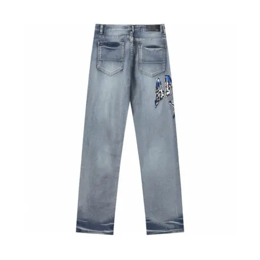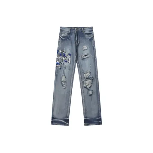 Amiri Straight Leg Logo Appliquéd Embroidered Distressed Jeans Light Blue