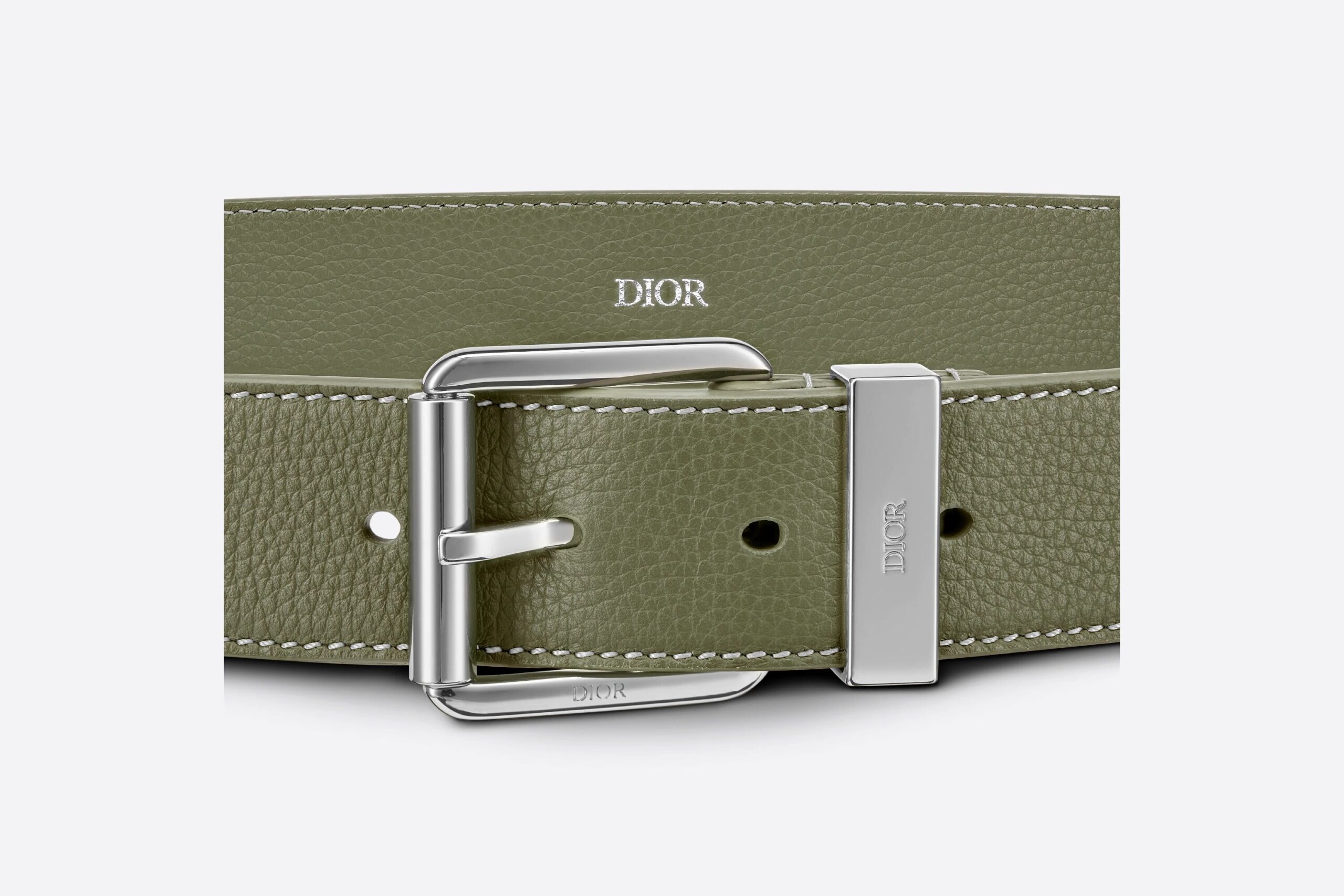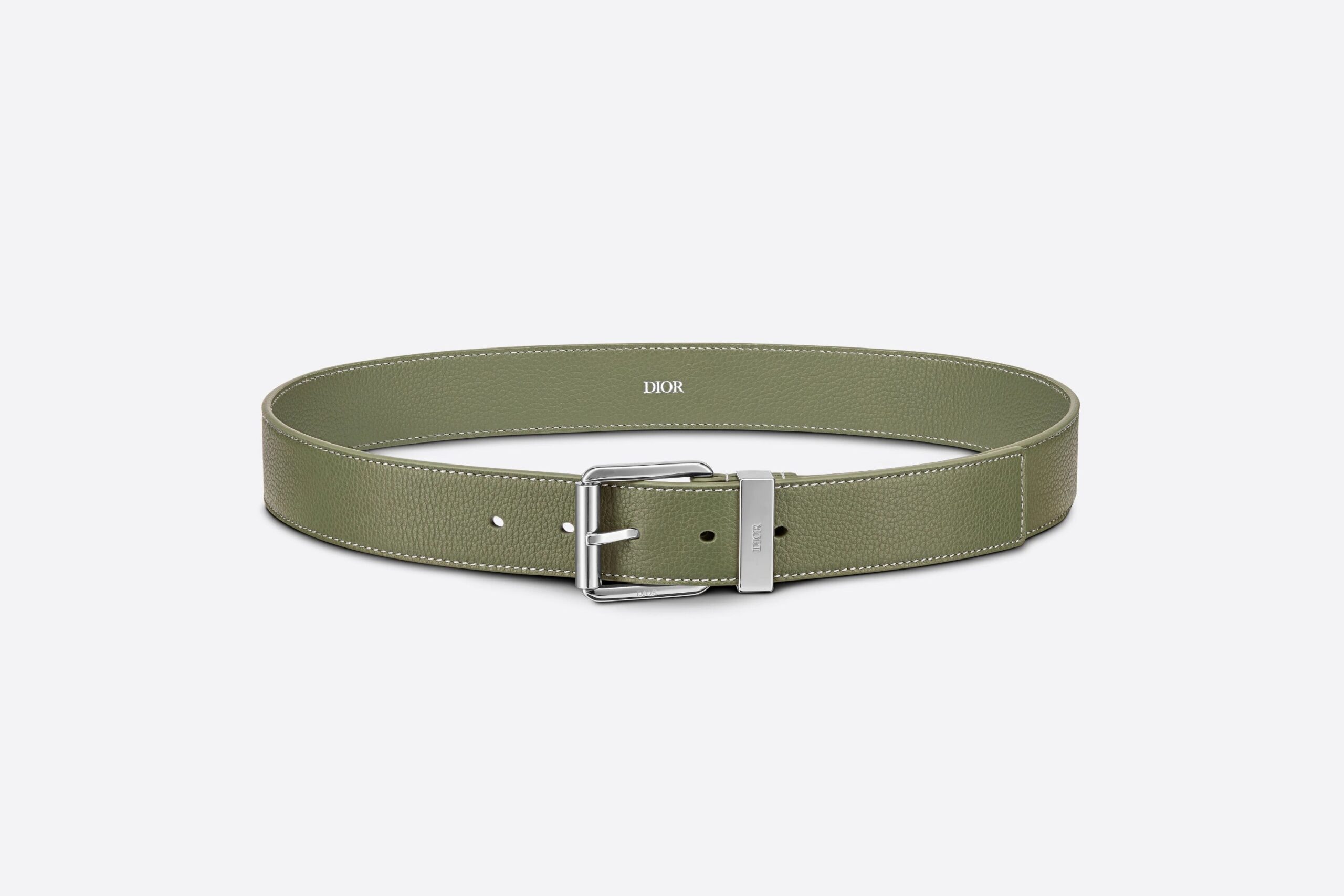 This 35mm adjustable length belt is made from khaki grained calfskin with contrast stitching. The palladium-finish brass buckle is discreetly embellished with an engraved “DIOR” signature. This piece can be combined with any look.