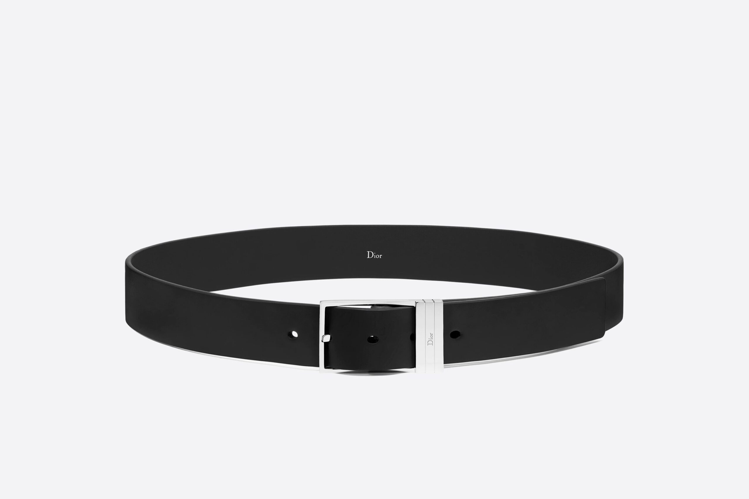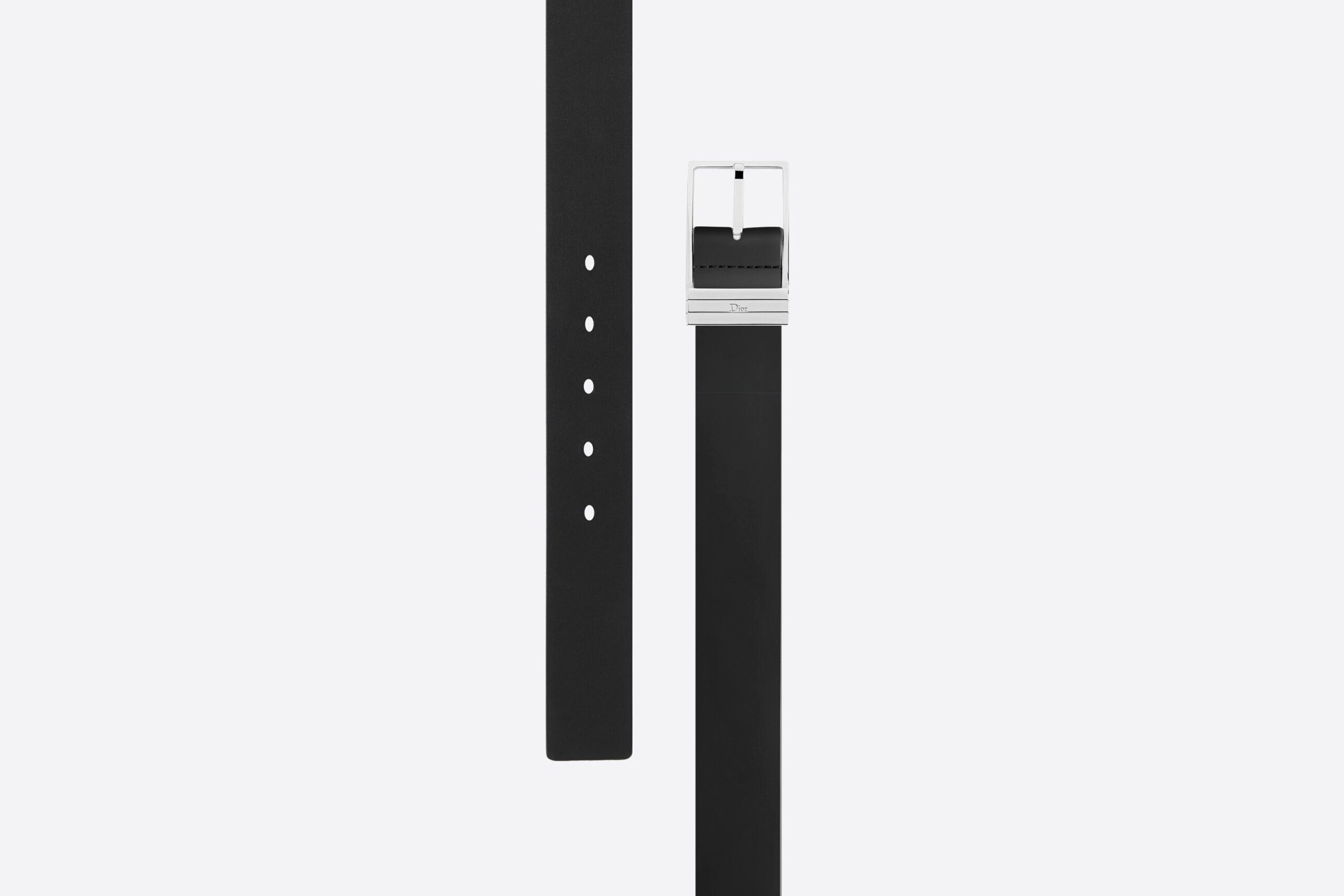 The 30mm single tang belt is made from black brushed calfskin for added refinement and elegance. Its rectangular buckle, adorned with a palladium finish and a subtly engraved Dior logo, creates a contrast between materials. This classic and sophisticated belt will enhance a formal outfit with elegance.