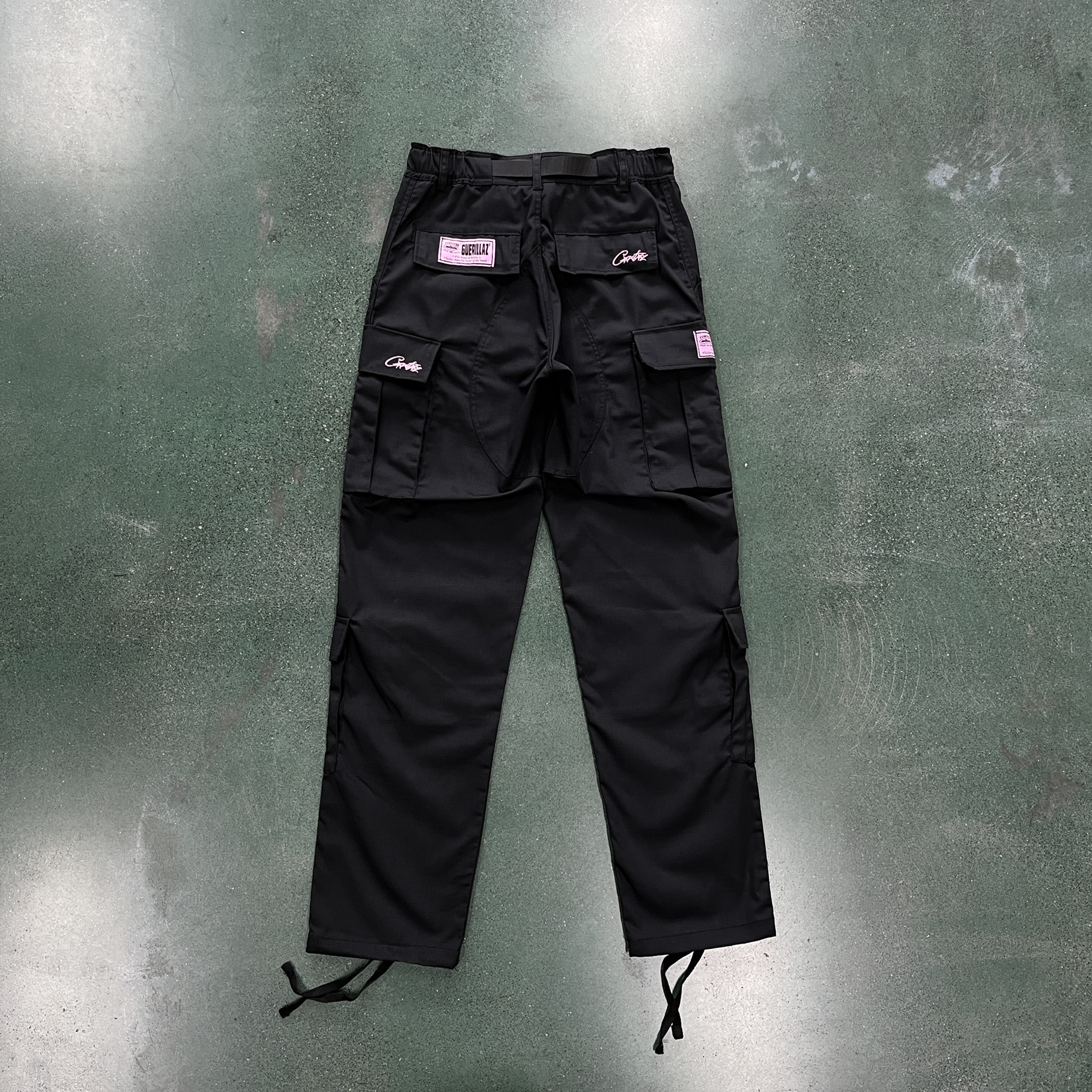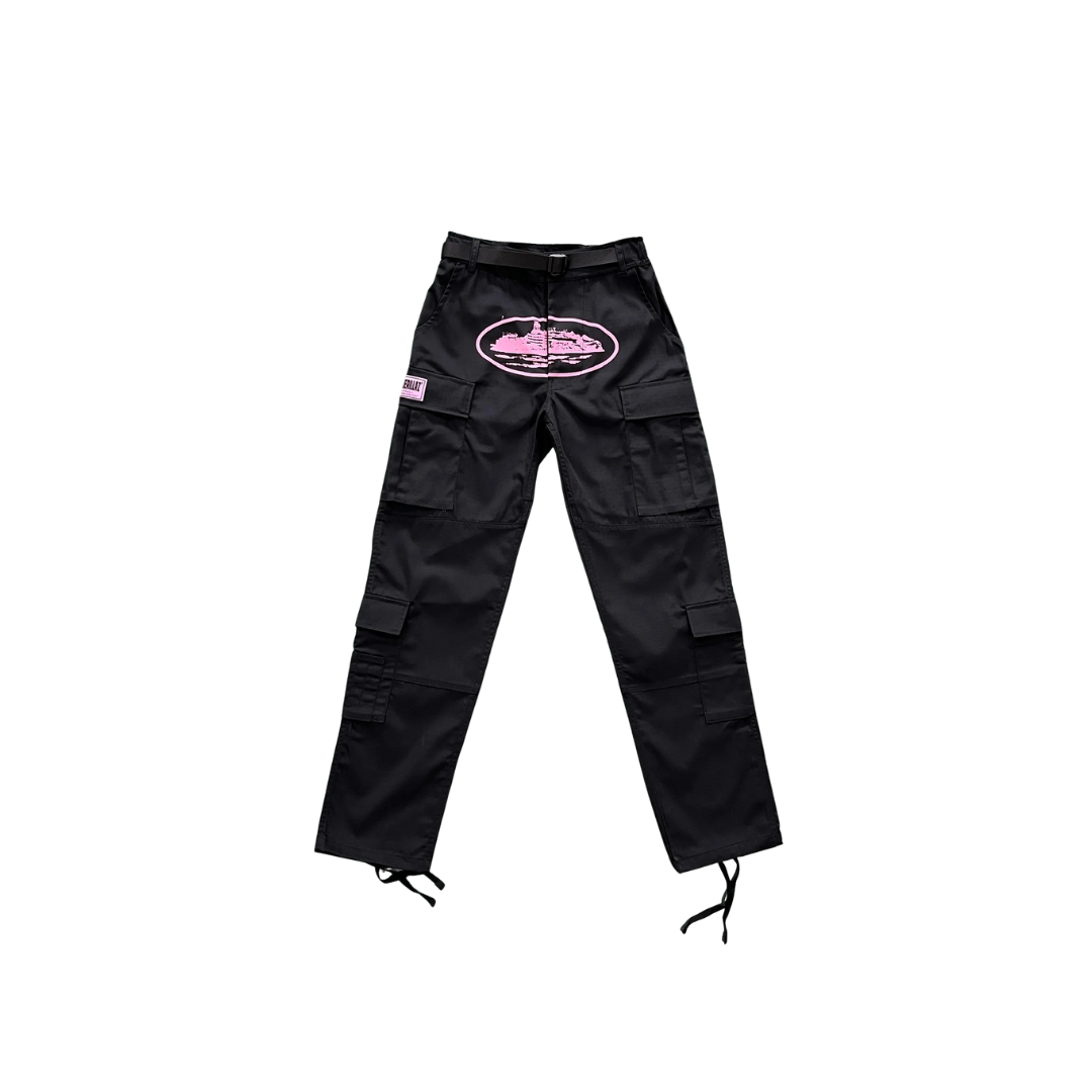 black with pink logo cargos