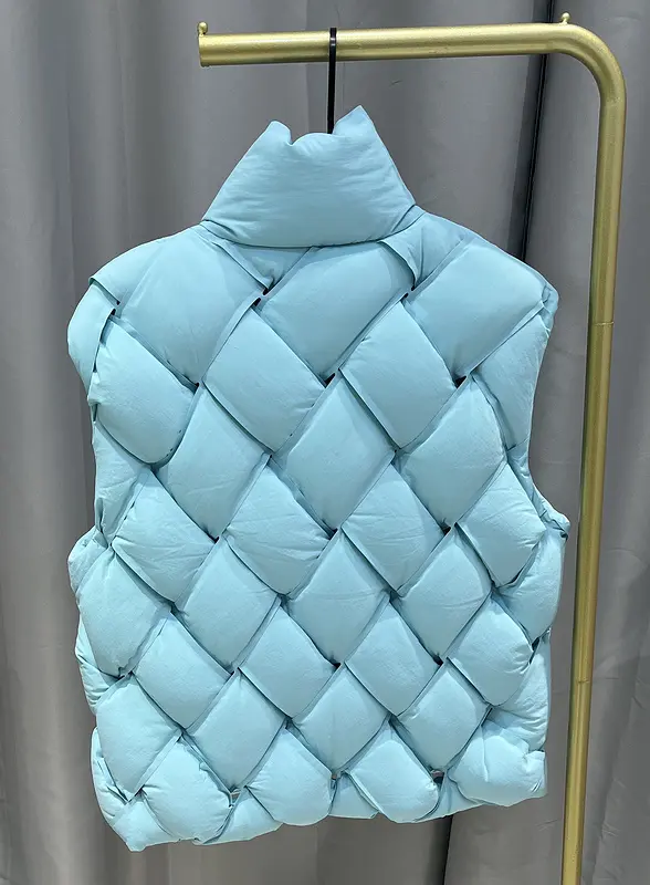 How do I clean and maintain my Sky Blue Bottega Veneta vest? To preserve the loft of the down filling and the vibrancy of the Sky Blue hue, we recommend professional dry cleaning only. Avoid machine washing or high-heat drying, as this can damage the Intrecciato woven structure and clumping the internal insulation.