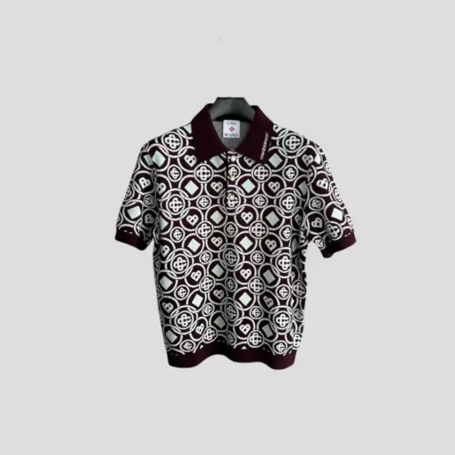 Casablanca Monogram Cotton Knit Polo Shirt In Burgundy With A Dark Brown And White All-OIver Monogram Pattern
