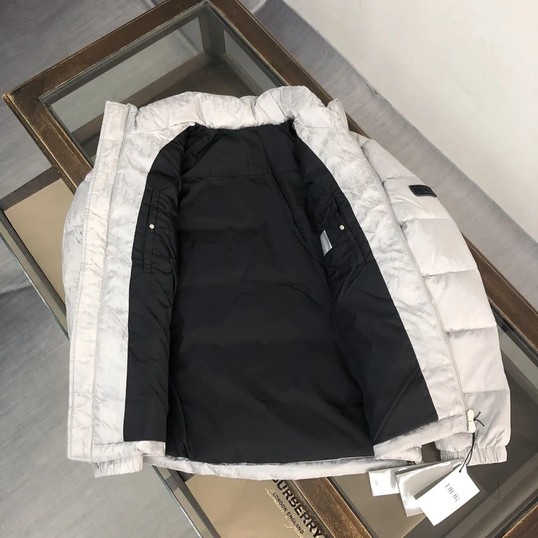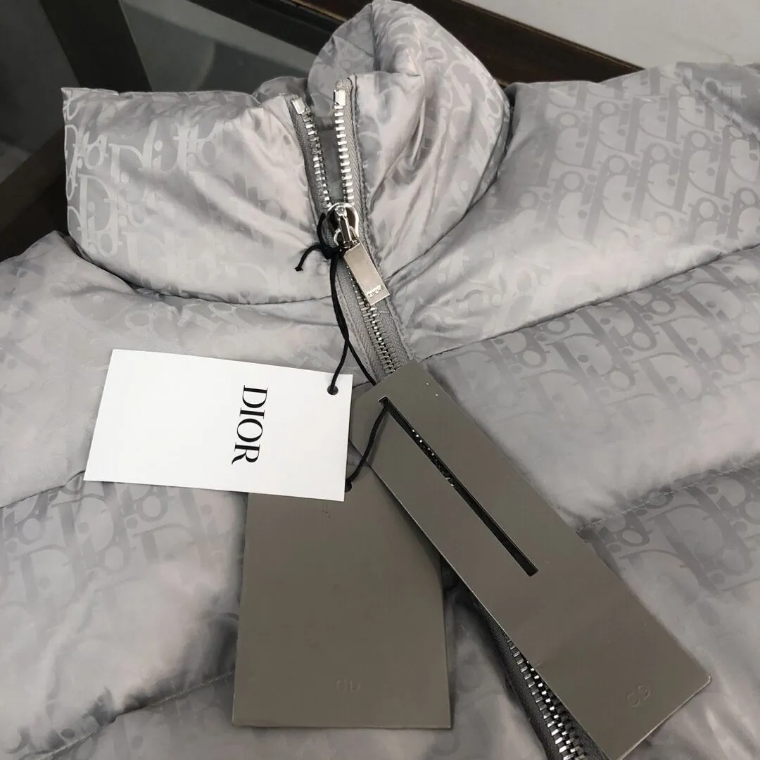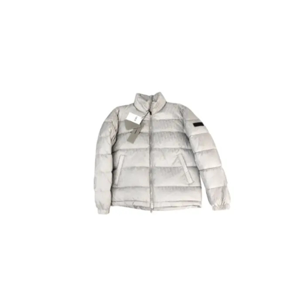 How do I clean and maintain my silver Dior jacket puffer? To preserve the loft of the down and the integrity of the silver jacquard motif, we recommend professional dry cleaning only. For minor surface spots, use a specialized luxury fabric cleaner. Always store your puffer jacket men version in a cool, dry place on a wide-shoulder hanger to maintain the structure.