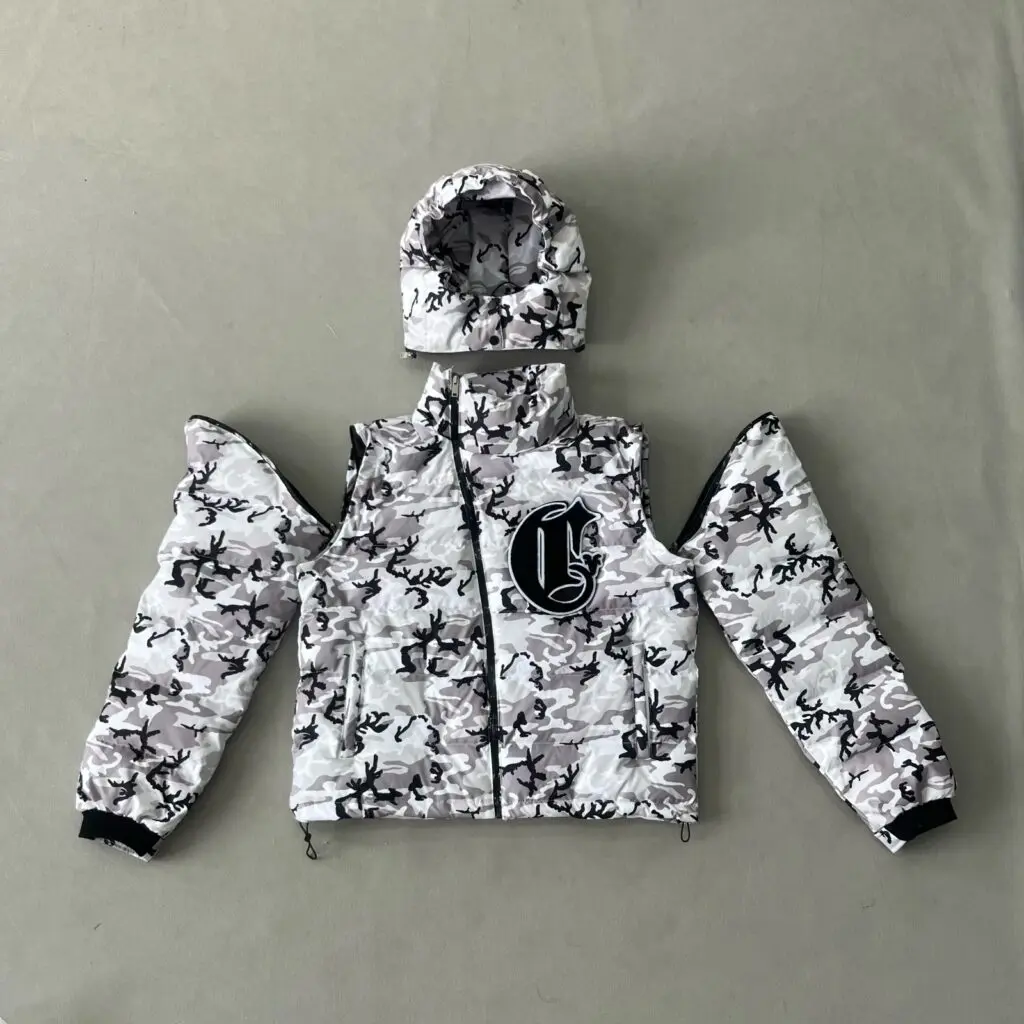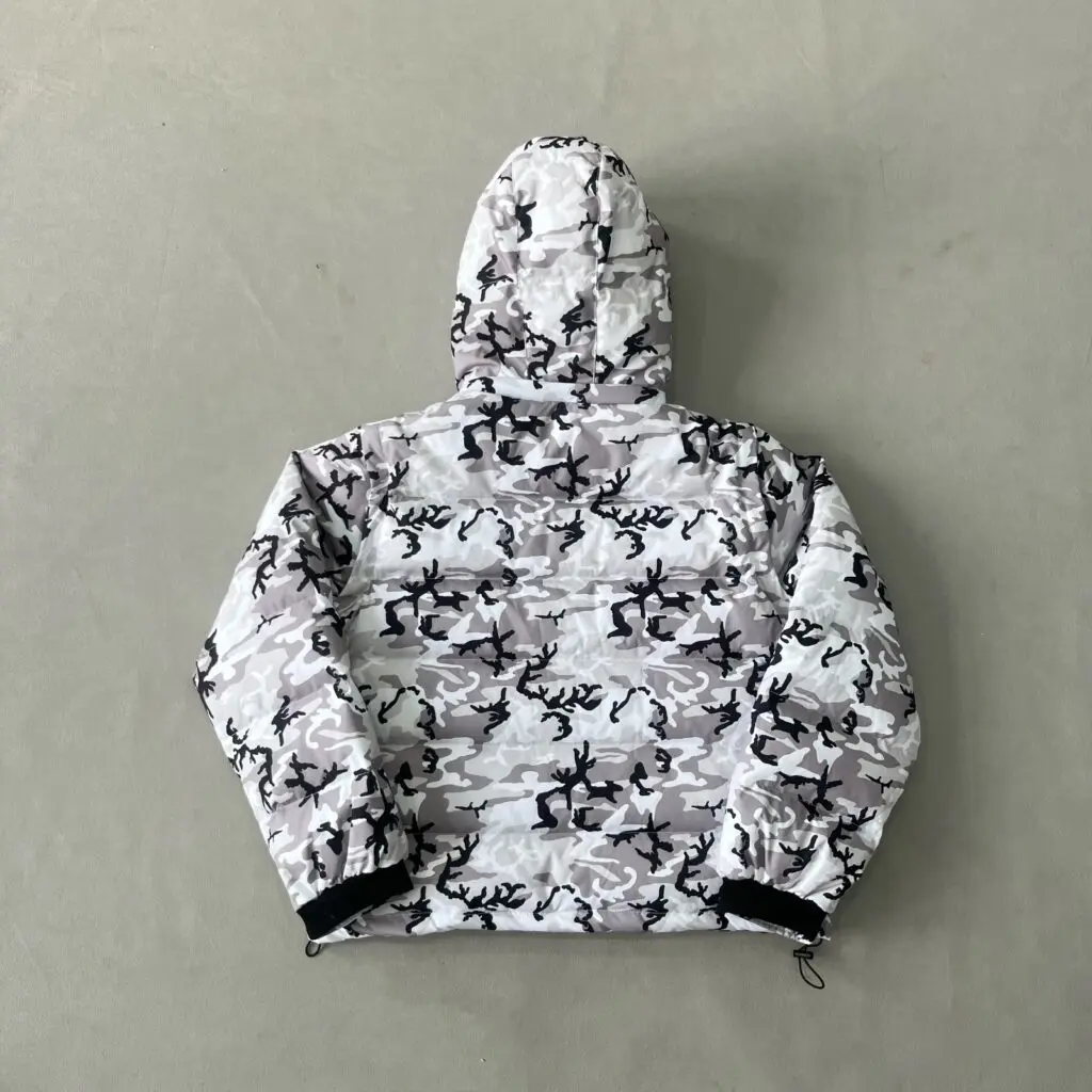 How do I clean and maintain my Snow Camo Puffer? To preserve the intricate camo pattern and the gothic “C” embroidery, we recommend professional dry cleaning. For minor surface spots, use a damp cloth. Avoid machine drying; air dry flat to maintain the insulation’s loft and the structural integrity of the shell.