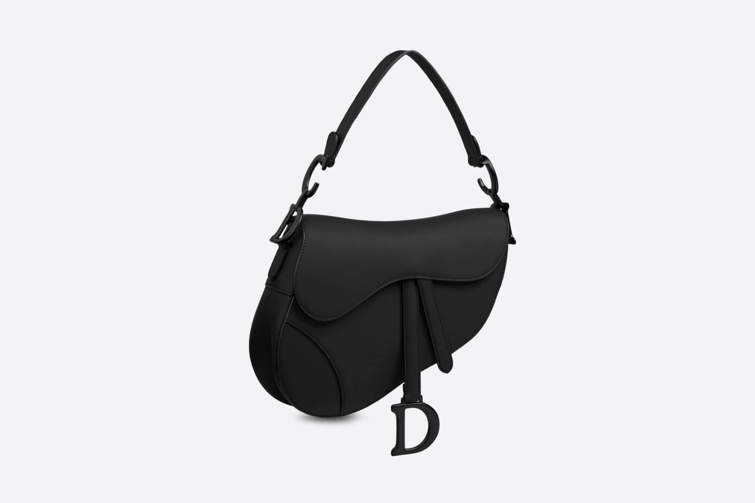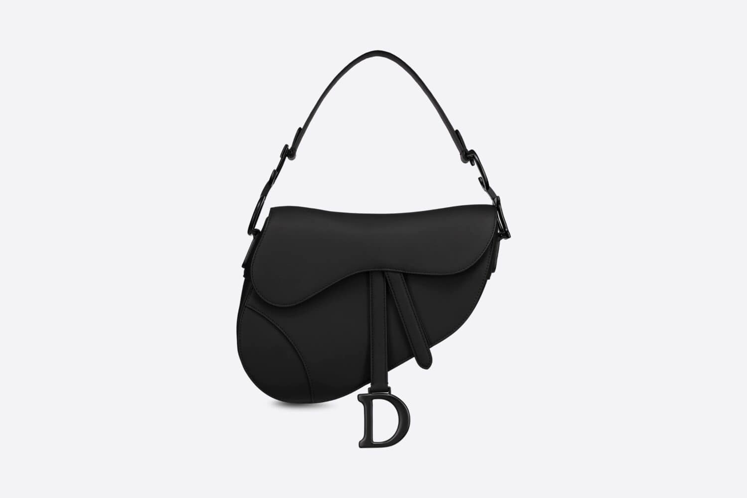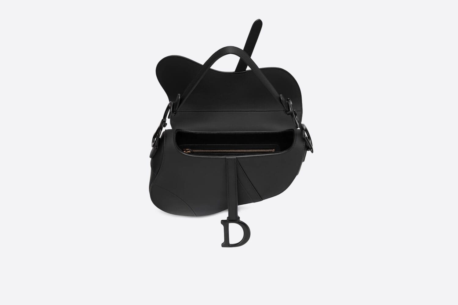 The iconic Saddle bag is reinvented once more by Maria Grazia Chiuri. Featuring a Saddle flap with a magnetic ‘D’ stirrup clasp, it boasts a ‘CD’ signature on each side of the handle. The black ultramatte calfskin style is embellished with tonal metal hardware. The Saddle bag may be carried by hand or worn over the shoulder and can be customized with different shoulder straps.