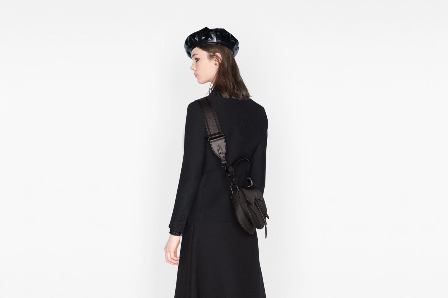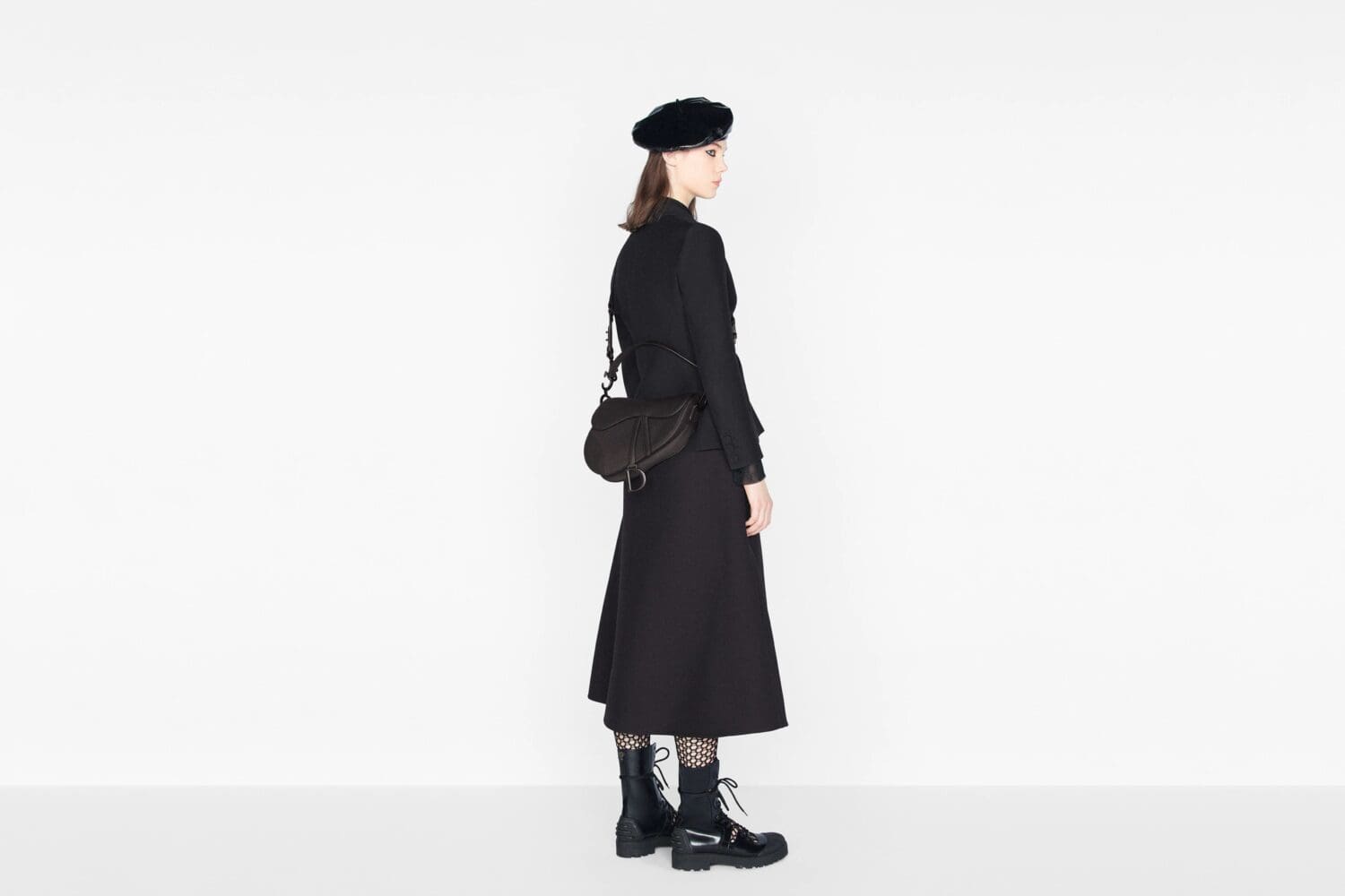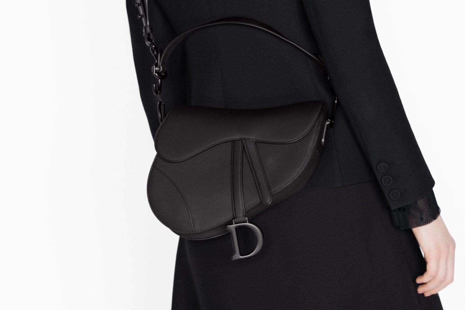 The iconic Saddle bag is reinvented once more by Maria Grazia Chiuri. Featuring a Saddle flap with a magnetic ‘D’ stirrup clasp, it boasts a ‘CD’ signature on each side of the handle. The black ultramatte calfskin style is embellished with tonal metal hardware. The Saddle bag may be carried by hand or worn over the shoulder and can be customized with different shoulder straps.