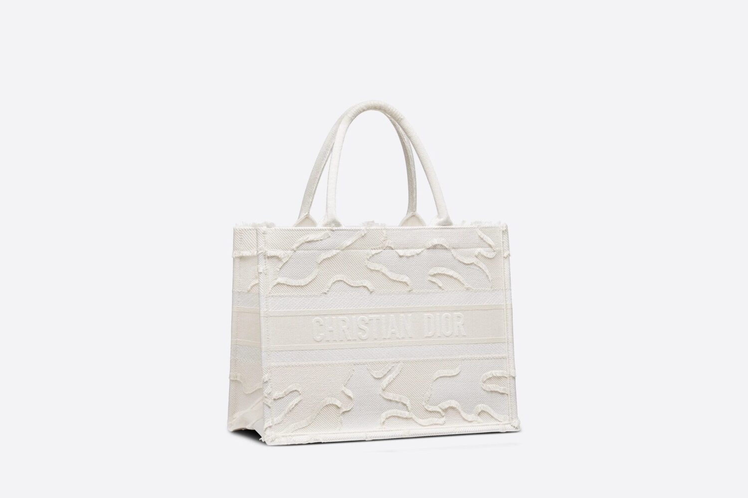 The Dior Book Tote, an original creation signed by Maria Grazia Chiuri, artistic director of Christian Dior, is already a classic of the House. Designed to carry all your everyday essentials, the small white model is embroidered with a tone-on-tone Christian Dior signature Camouflage motif on the front. This carrycot is a good example of Dior savoir-faire and can be combined with other accessories, such as the Mitzah scarf.