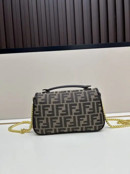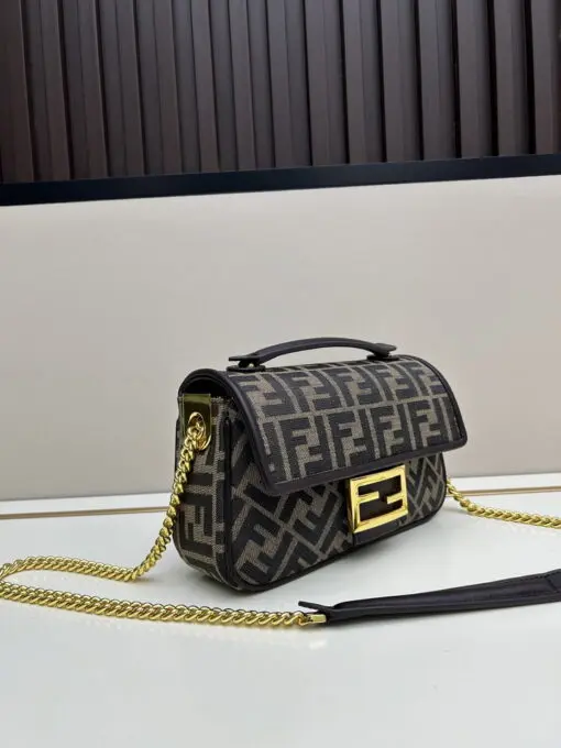 Fendi Baguette Chain Midi Stylish Shoulder Bag Black & Brown FF Canvas Jacquard Fabric