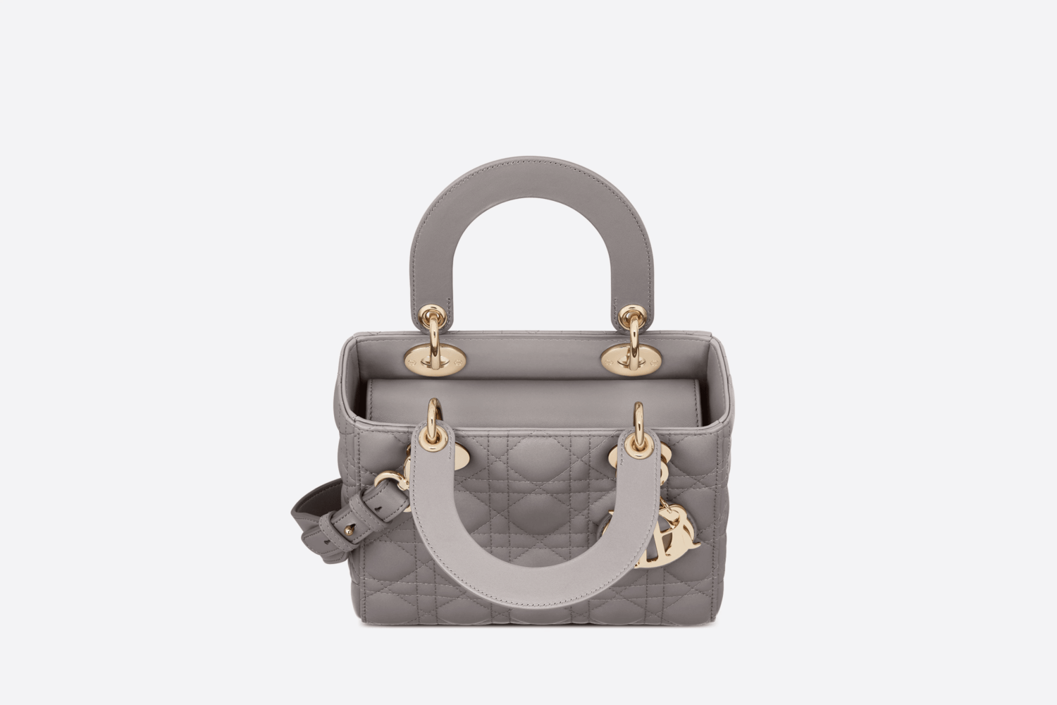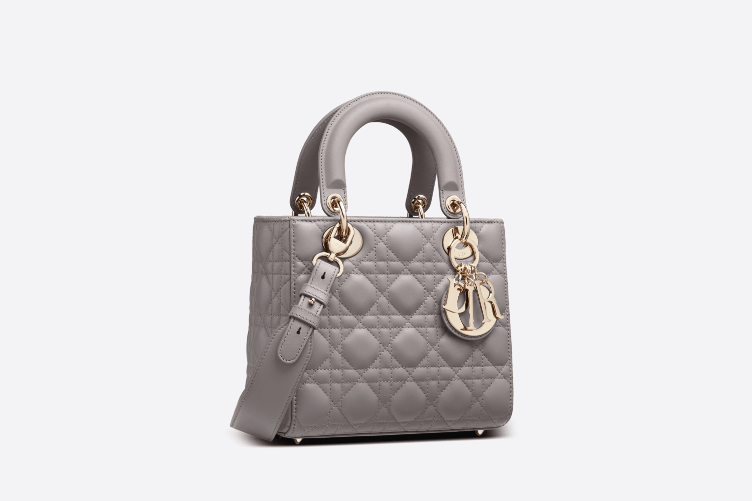 The Lady Dior My ABCDior bag perfectly reflects the House’s vision of elegance and beauty in a delicate piece that is timeless as well as modern. Crafted from steel gray lambskin and covered in iconic Cannage stitching, this model features a quilted texture and “D.I.O.R.” charms. in pale gold metal for an elegant touch. The shoulder strap can be personalized with pins and allows this unique creation to be carried in the hand, slung over the shoulder or across the body.