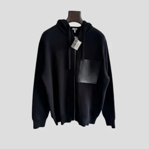Loewe Anagram Zip-Up Hoodie In Wool With A Leather Chest Patch Pocket In Black