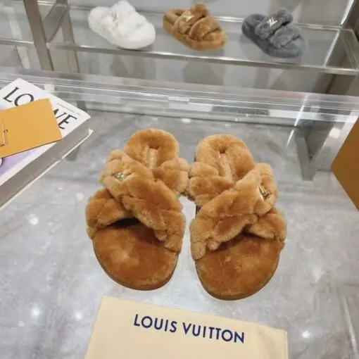 LV Bliss Brand Plaque Shearling Mules Plush Straps Gold Tone