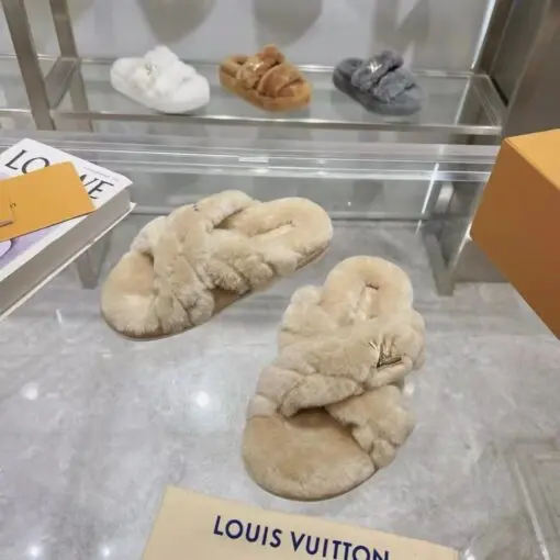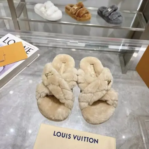 LV Bliss Comfort Mules Fluffy Shearling Crossover Straps With Embroidered Malletage Pattern Beige