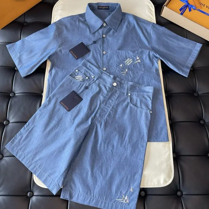 LV Embroidered Chambray Suite Set Blue