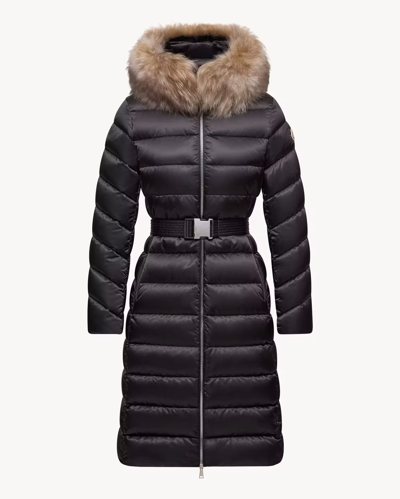 Moncler Leersie Hooded Shearling-Trimmed Long Down Jacket Black