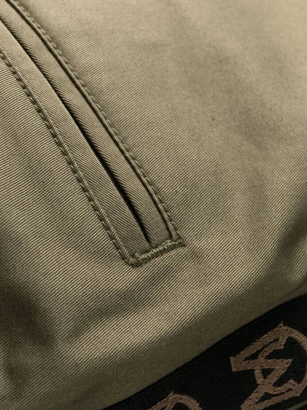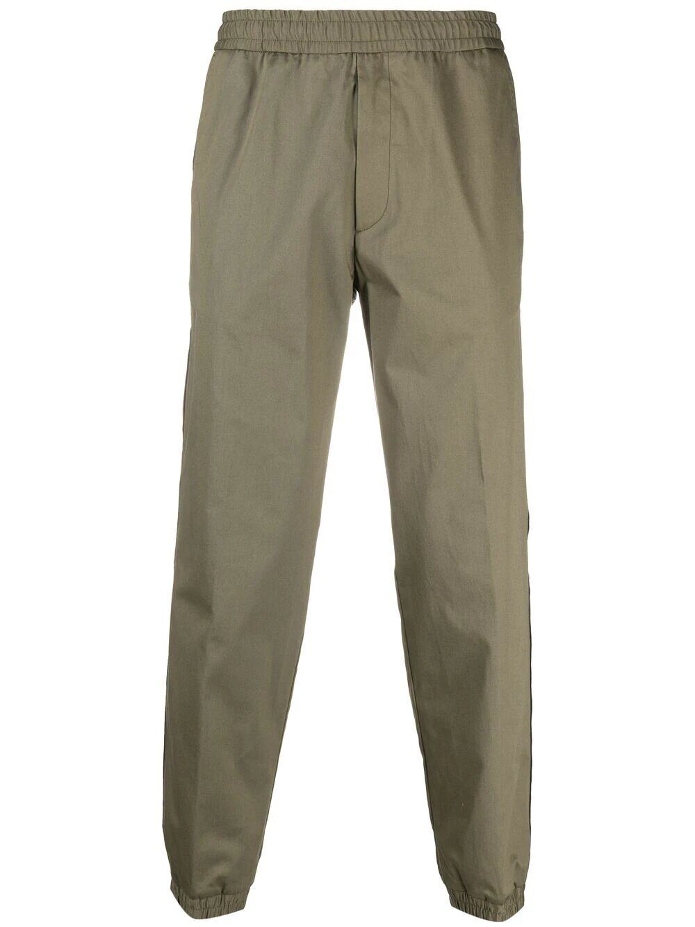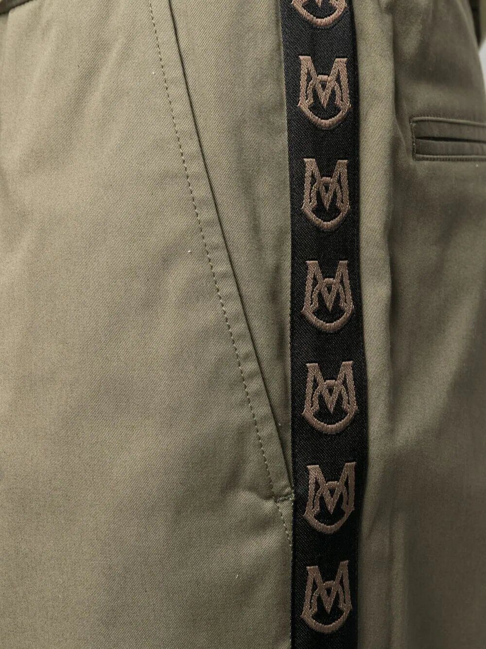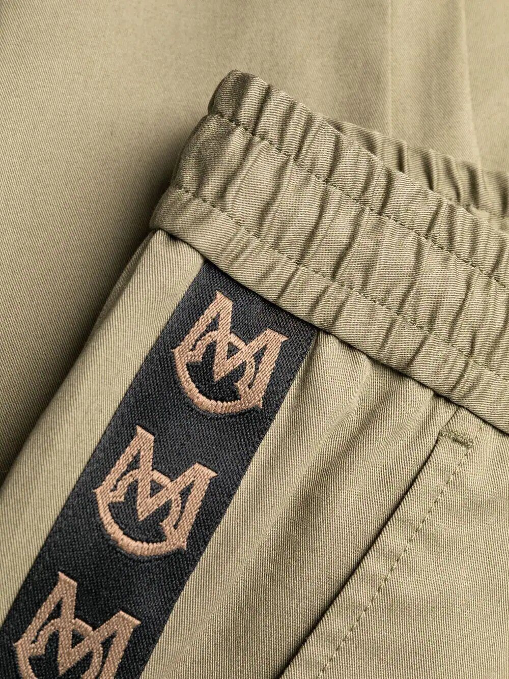 Beige trousers with an elastic waist and various logos along the legs on the side.