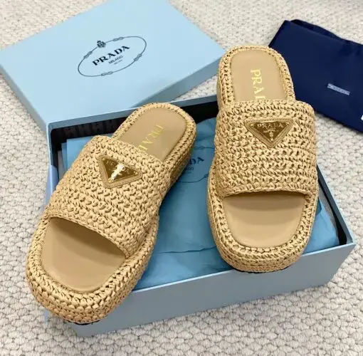 Prada Raffia Flatform Slide Sandal Beige