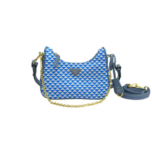 Prada Triangle Shoulder Hobo Bag Blue White Jacquard Canvas