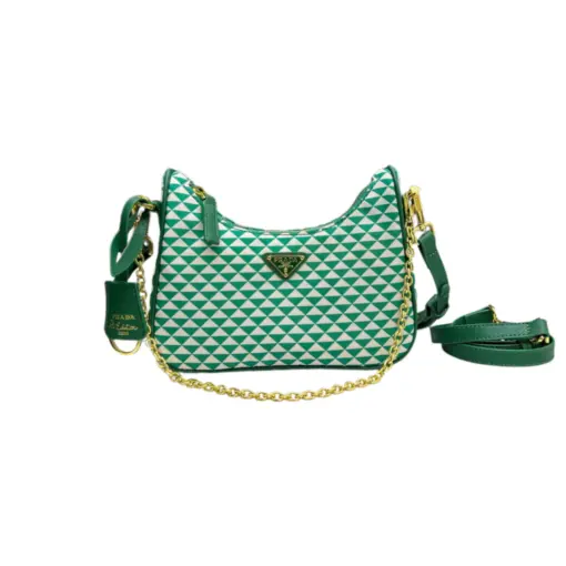 Prada Triangle Shoulder Hobo Bag Green White Jacquard Canvas