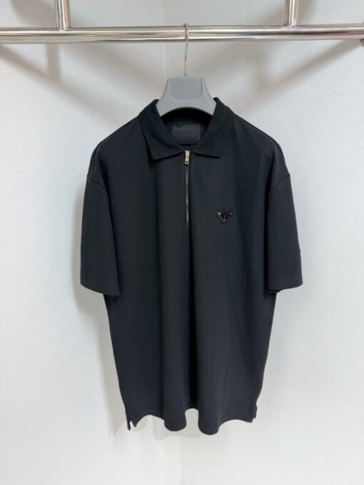 Prada Zipped Metal Logo Polo T-Shirt Black