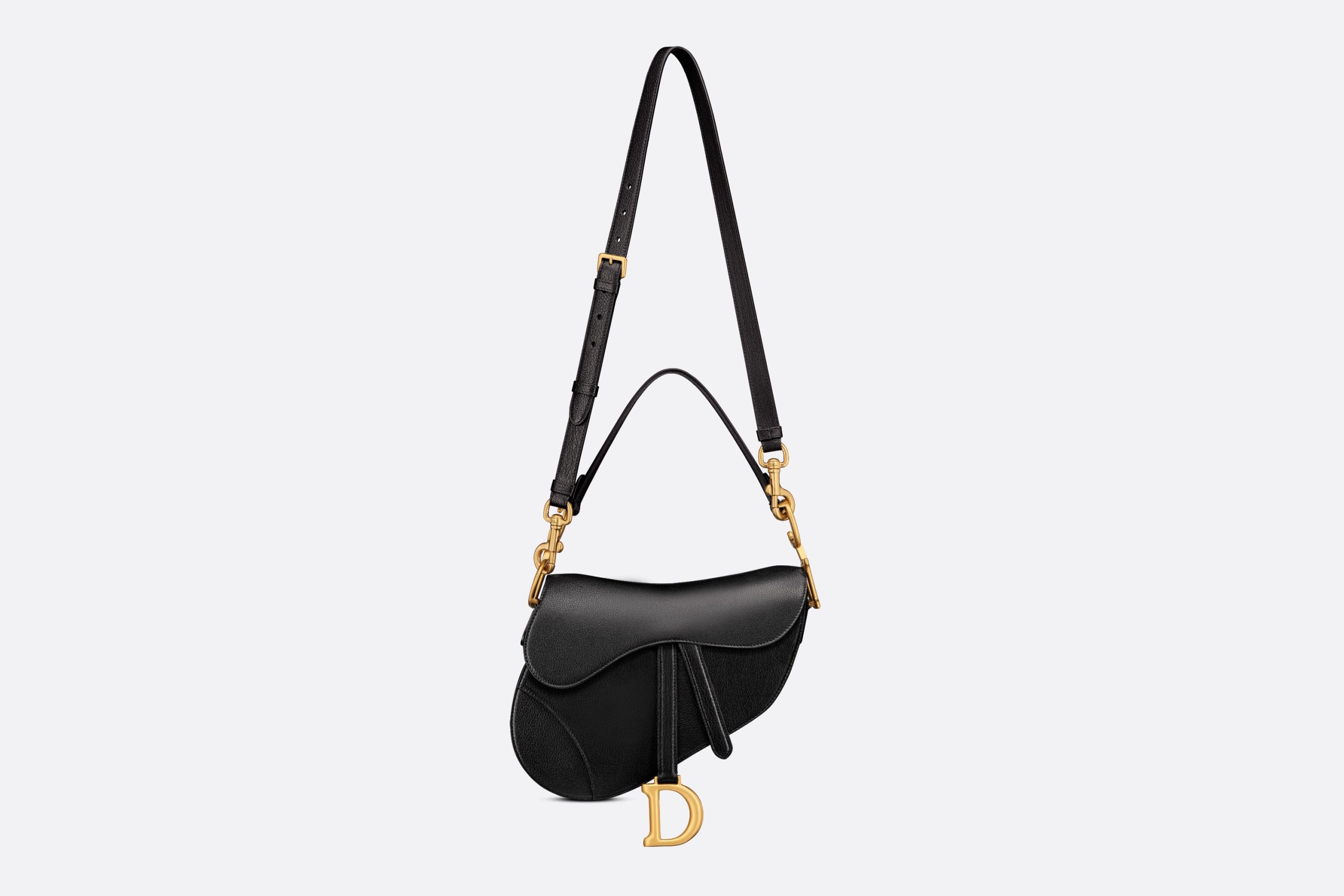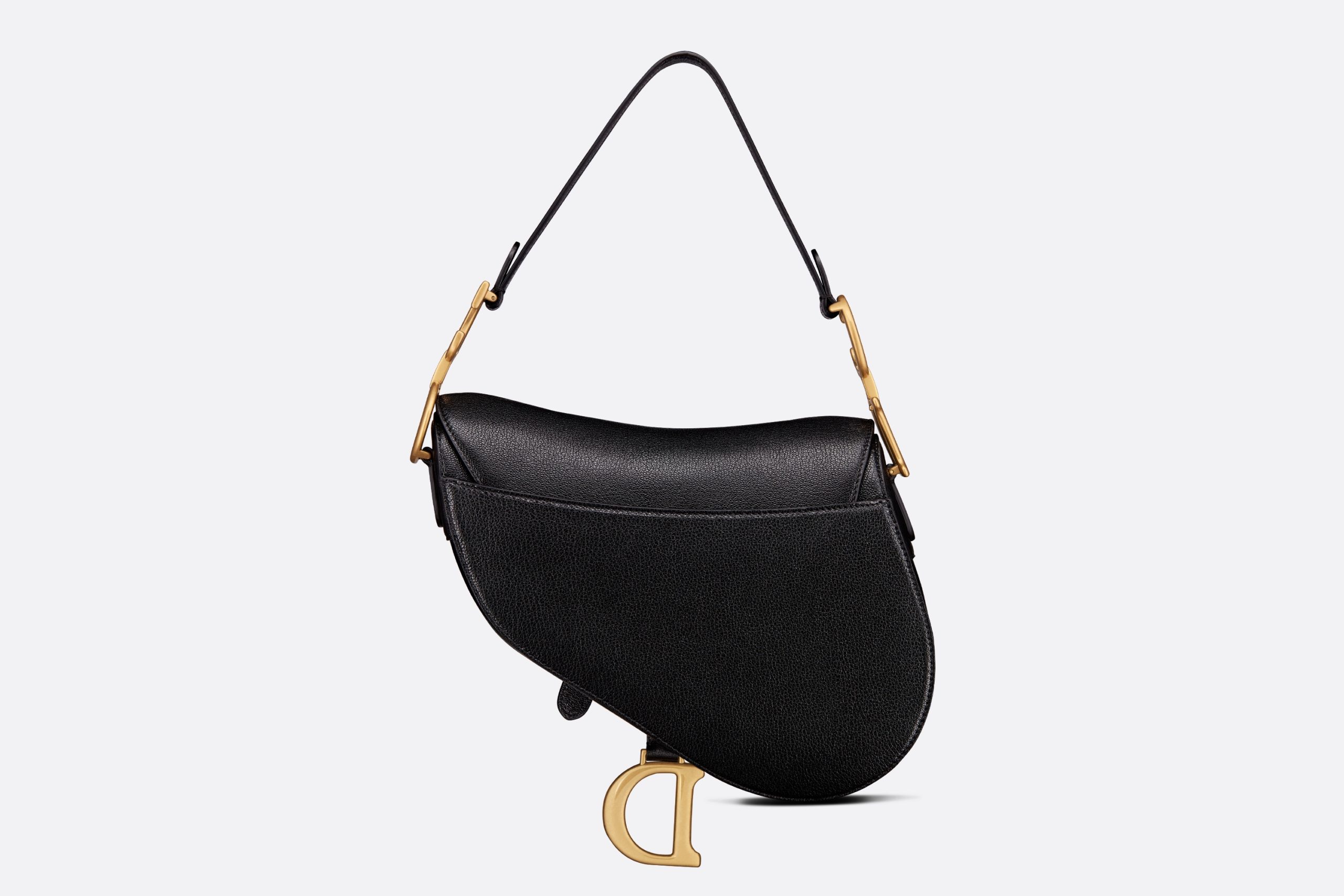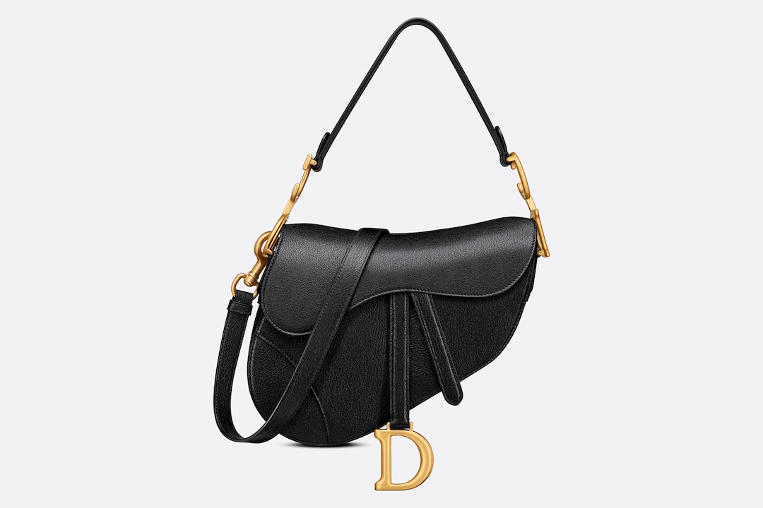 Maria Grazia Chiuri gives the signature saddle bag a whole new look. The characteristic design made of black goatskin with a flap in the shape of a saddle flap and a stirrup-shaped D clasp on a magnetic strap also impresses with a CD decorative piece made of metal with an antique gold finish on both sides of the strap. Thanks to the narrow, adjustable and removable shoulder strap, the saddle bag can be carried in the hand or as a shoulder or crossbody bag.