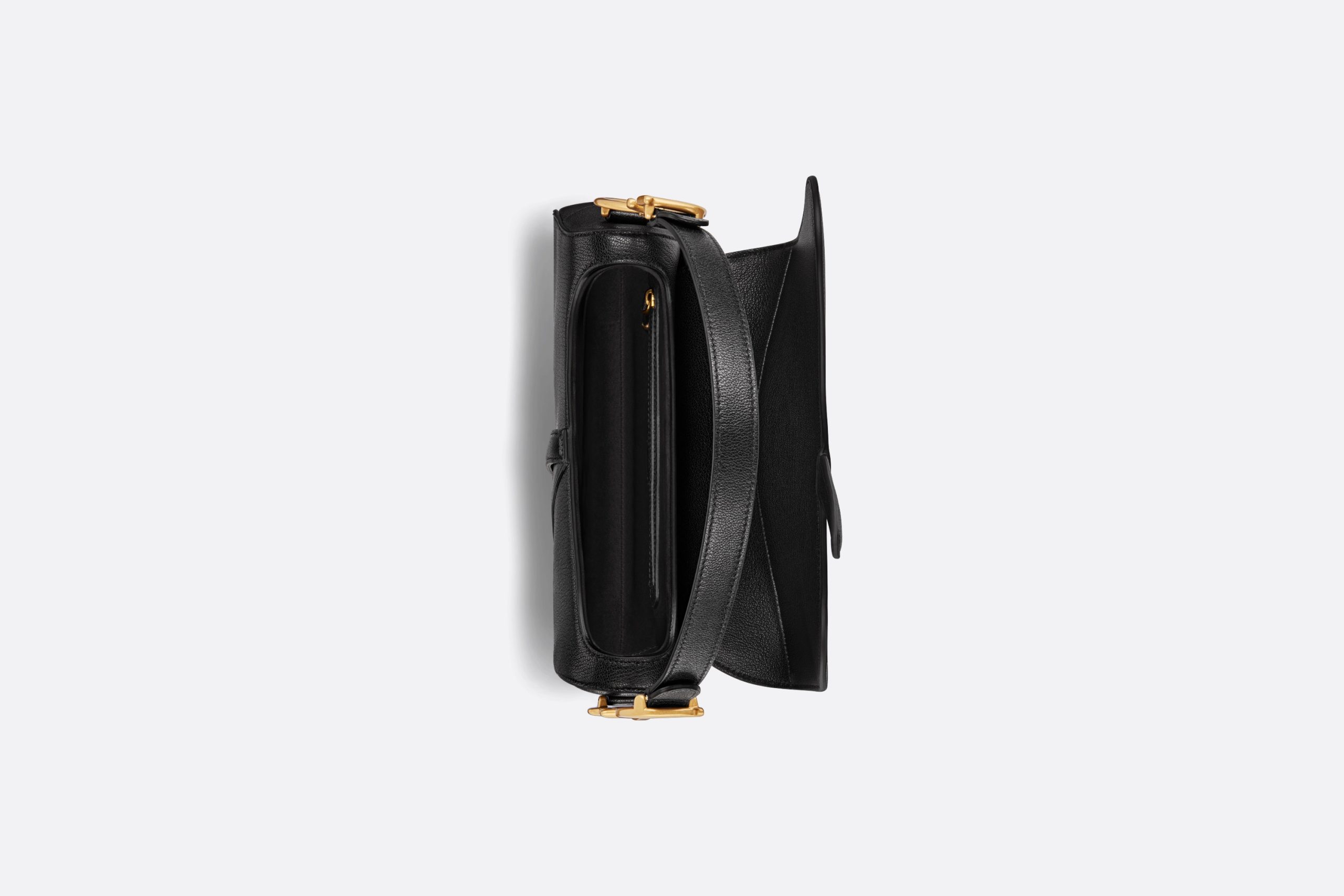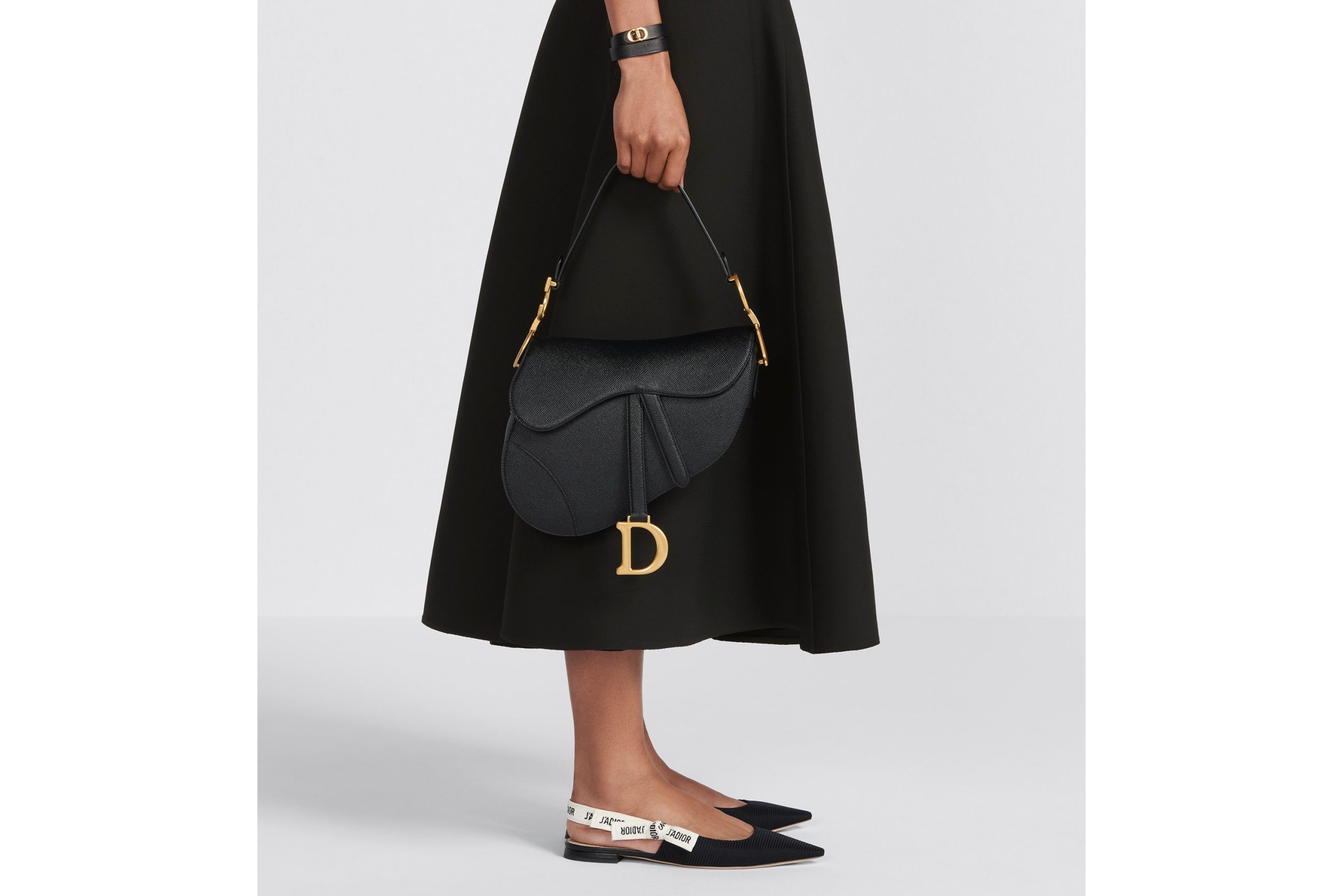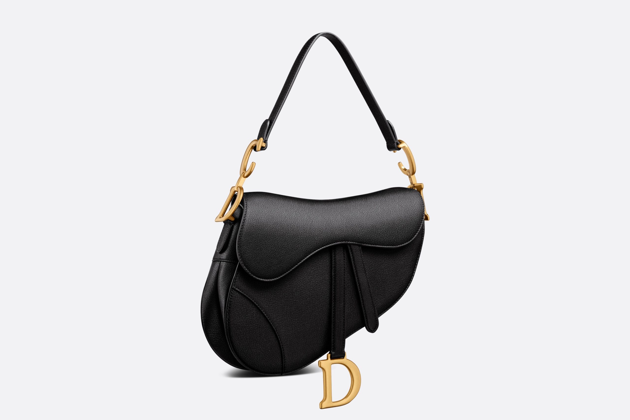 Maria Grazia Chiuri gives the signature saddle bag a whole new look. The characteristic design made of black goatskin with a flap in the shape of a saddle flap and a stirrup-shaped D clasp on a magnetic strap also impresses with a CD decorative piece made of metal with an antique gold finish on both sides of the strap. Thanks to the narrow, adjustable and removable shoulder strap, the saddle bag can be carried in the hand or as a shoulder or crossbody bag.