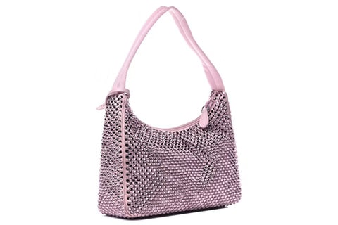 This mini hobo bag, an iconic Prada style, comes in a luxurious satin version studded with crystals and decorated with the emblematic enamel triangle logo.