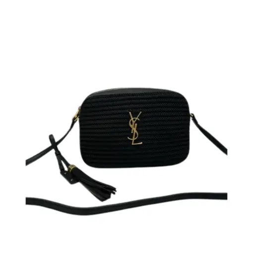 YSL Lou Raffia Leather Camera Bag Black Gold Monogram